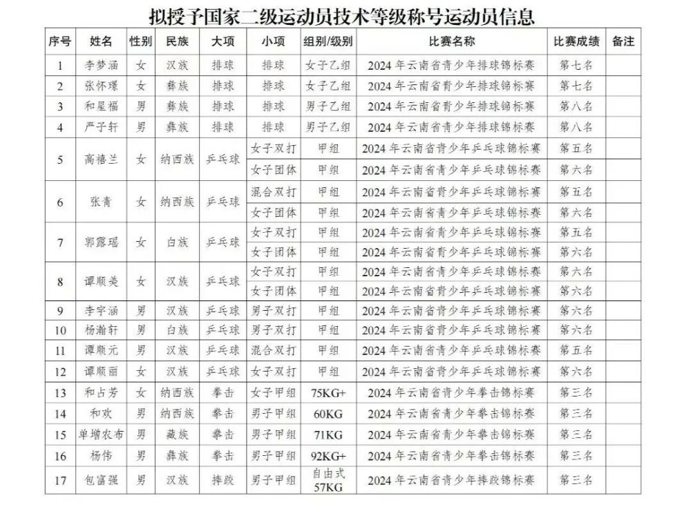 以下为拟授予国家二级运动员技术等级称号运动员信息↓