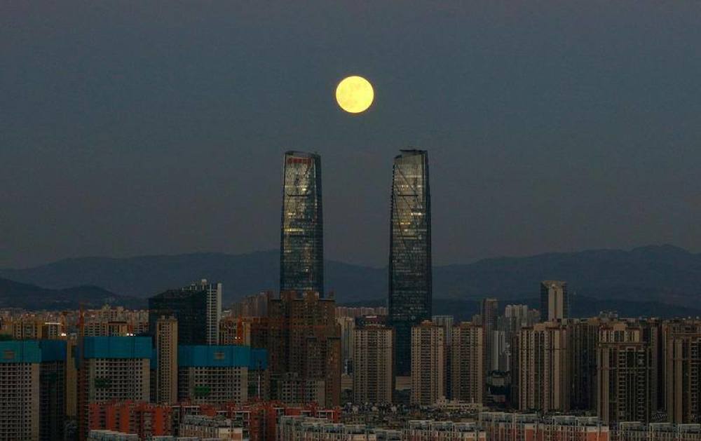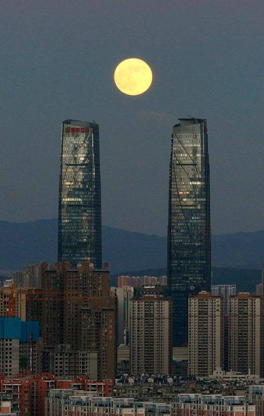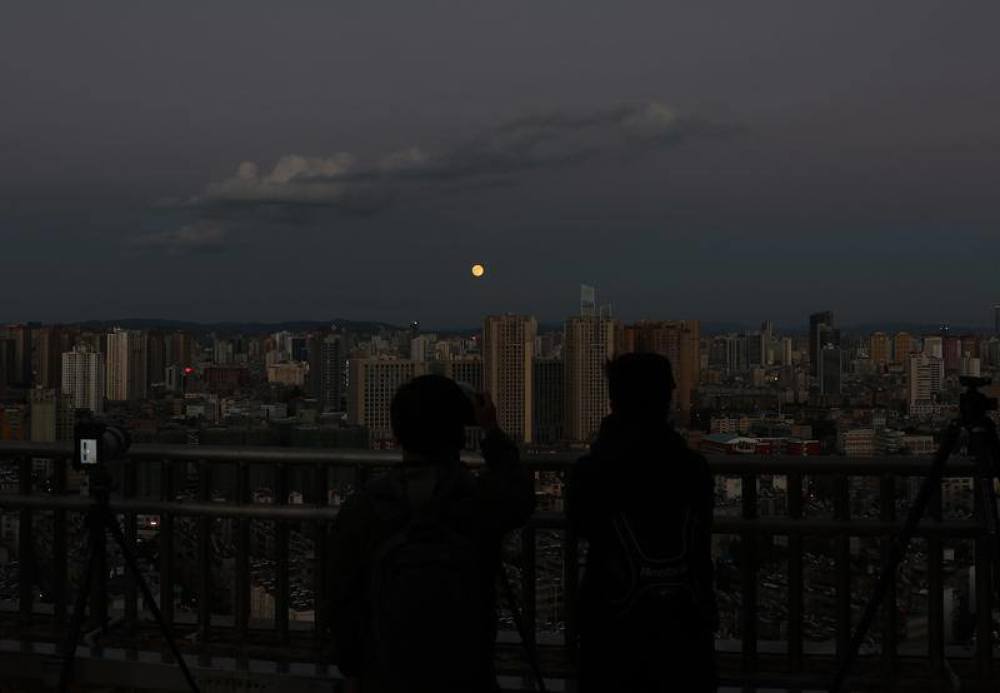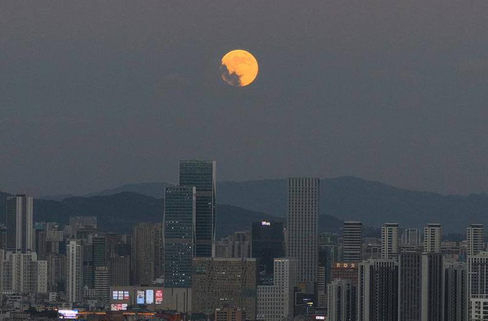 10月17日下午6时37分,一轮“超级满月”从昆明地平线缓缓升起,与城市同框景象美不胜收。