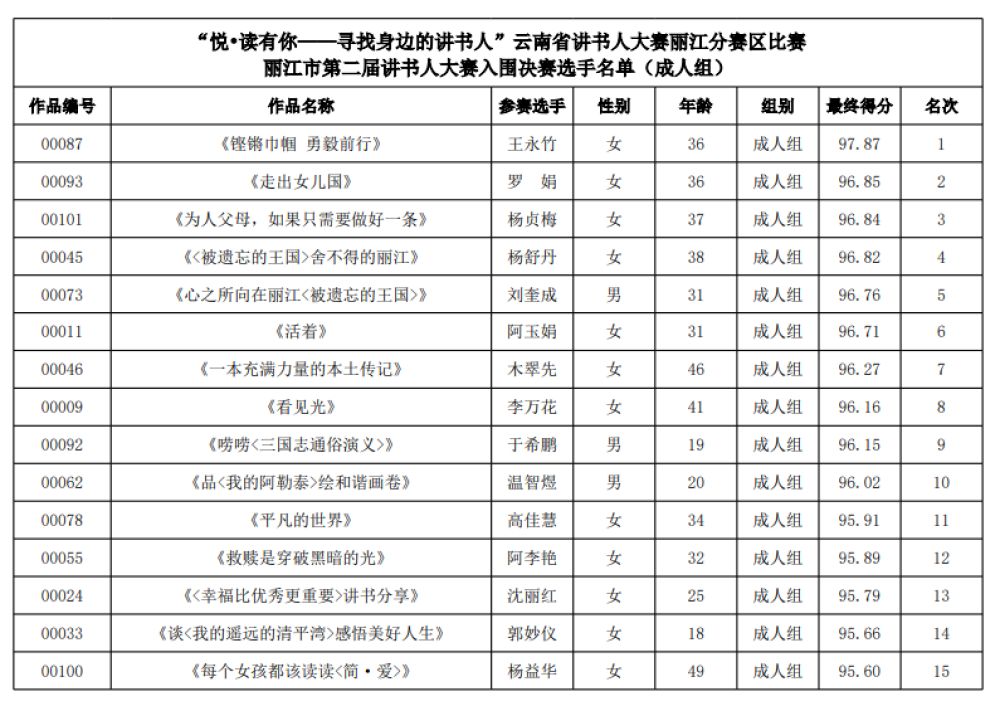 暨丽江市第二届讲书人大赛入围决赛选手名单公告