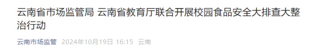 为切实加强校园食品安全管理工作,督促全省各级各类学校严格落实食品安全主体责任,防范化解风险隐患,10月18日,省市场监管局、省教育厅印发《关于开展学校落实食品安全主体责任暨风险隐患大排查大整治工作的通知》,决定从即日起在全省范围内开展校园食品安全风险隐患大排查大整治。