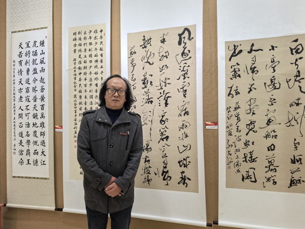 和国强跟他的作品。(丽江融媒记者 秦文静 摄)