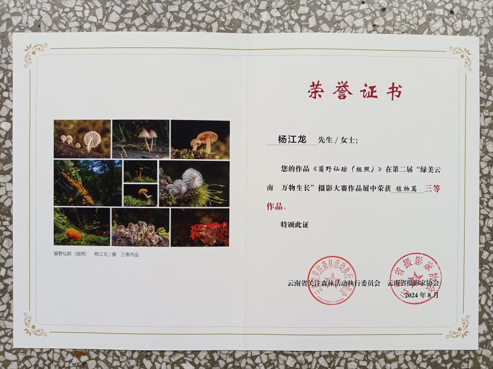 日前,丽江摄影师杨江龙的组照《菌野仙踪》在云南省第二届“绿美云南 万物生长”摄影大赛中获得三等奖。