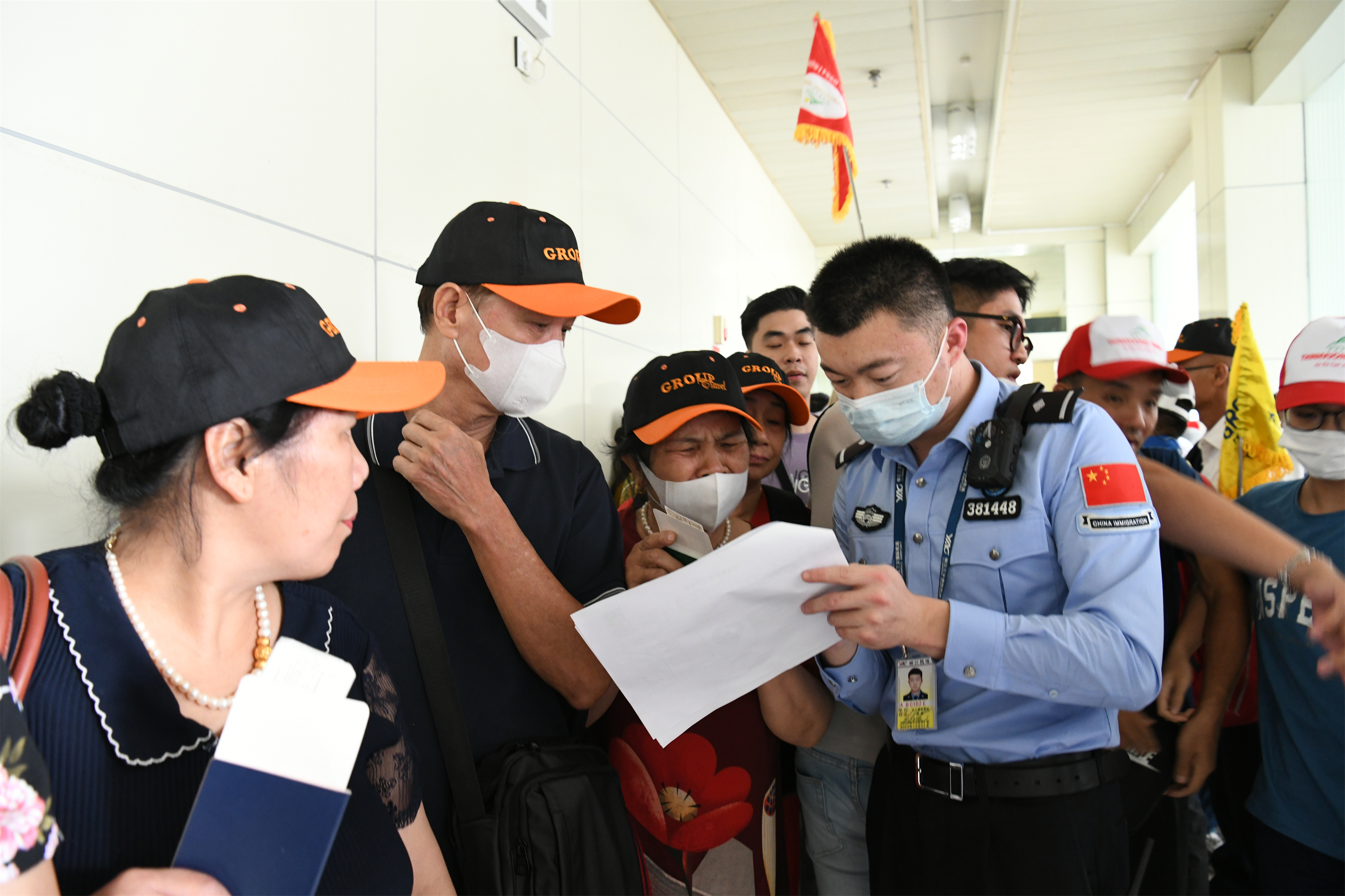 在丽江三义国际机场,民警为入境旅客办理边防检查手续。(丽江融媒记者 赵庆祖 摄)