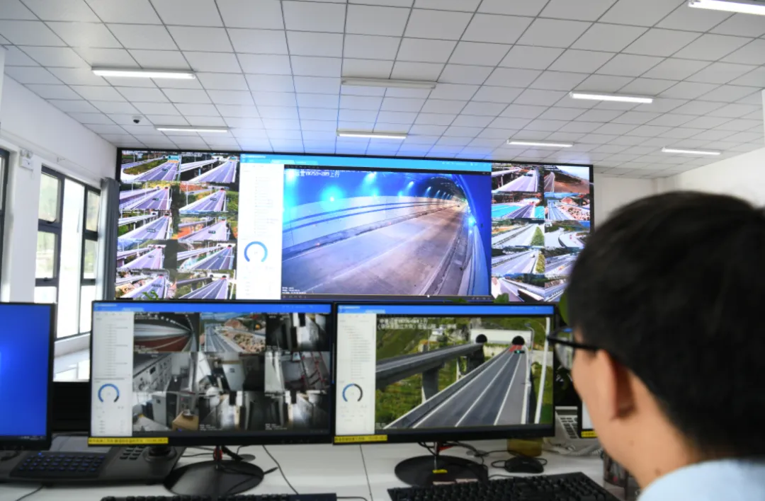 华丽高速信息服务中心(监控中心)监控员通过监控大屏,实时关注道路通行情况。(赵庆祖 摄)