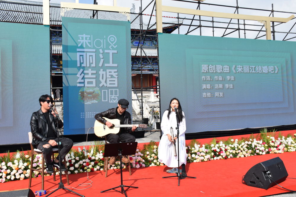 10月28日,丽江歌手李佳、浩斯及其乐队在推介会上演唱歌曲《来丽江结婚吧》 。(杨四娟 摄)