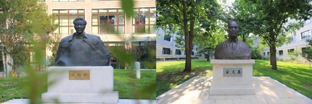 △左图为中央党校(国家行政学院)校园内的焦裕禄雕塑,右图为校园内的谷文昌雕塑。