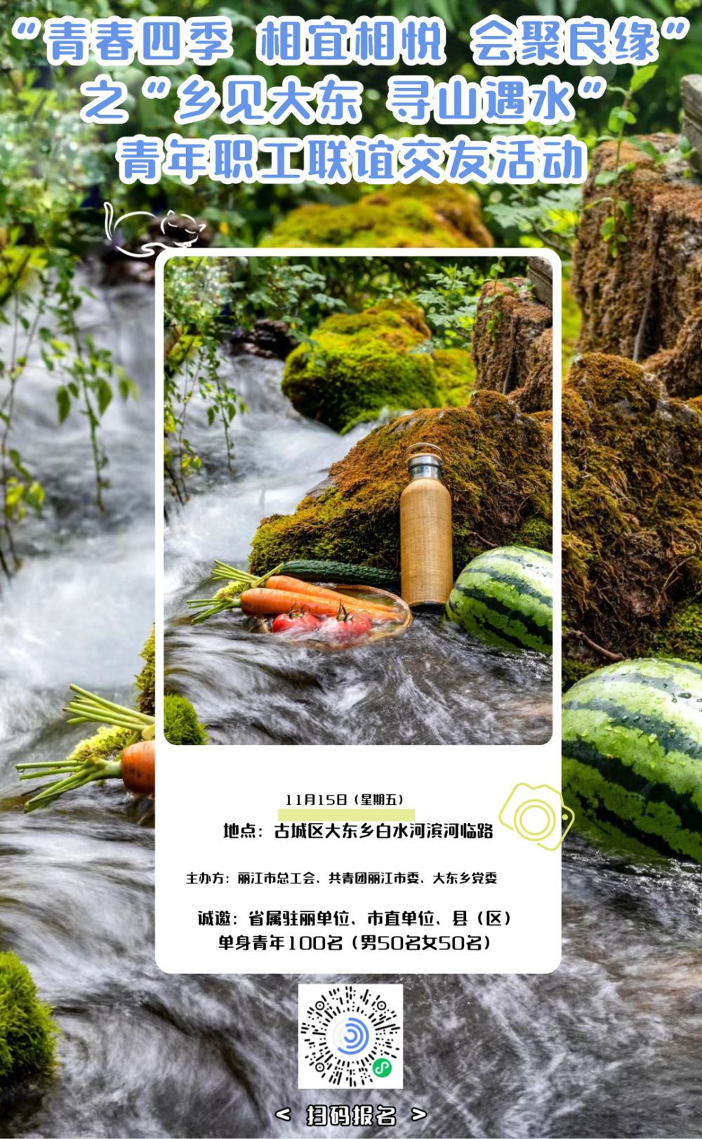 为学习贯彻党的二十届三中全会精神,进一步落实《丽江市中长期青年发展规划(2019 年——2025年)》,发挥共青团服务青年的职能作用,聚焦青年群体所急所需所盼,以“联谊交友+体验非遗+乡村振兴”为基调,为省属驻丽单位、市直单位、各县(区)单身青年提供自由交友、成长提升的平台,共青团丽江市委联合丽江市总工会、古城区大东乡党委举办“青春四季 相宜相悦 会聚良缘”之“乡见大东 寻山遇水”青年职工联谊交友活动。
