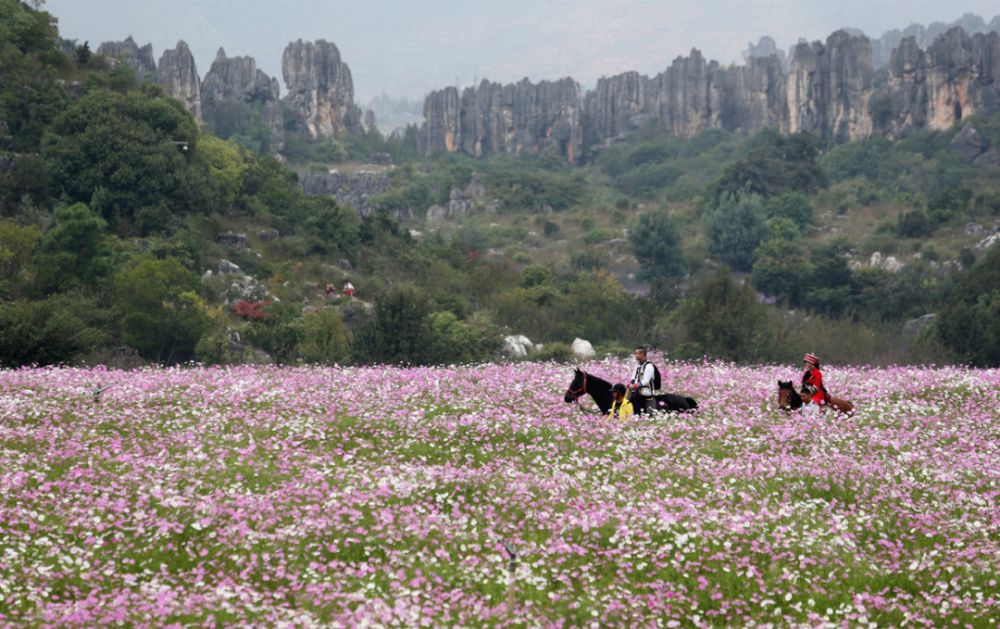 十月的深秋,位于昆明市石林彝族自治县乃古石林的波斯菊绽放出粉色花海,与奇特的喀斯特地貌相互映衬,为游客呈上一席视觉的盛宴。