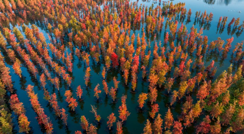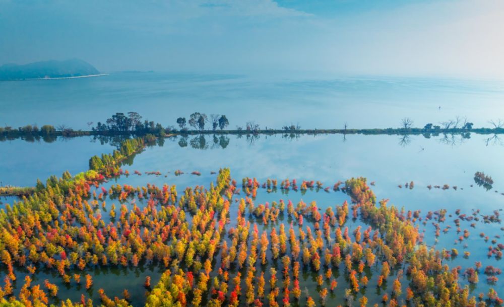 秋意渐浓,云南滇池畔的水杉林正上演着一场视觉盛宴。微风轻拂,深红与暖黄交织,水杉树仿佛调色盘上不经意间洒落的颜料,开启了秋日独有的“美拉德”配色。