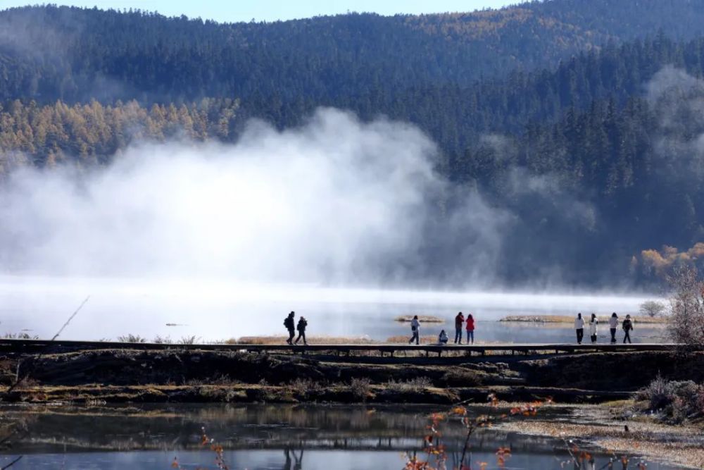 游客在属都湖“晨雾倒影”景观中徒步 胡妤雅 摄