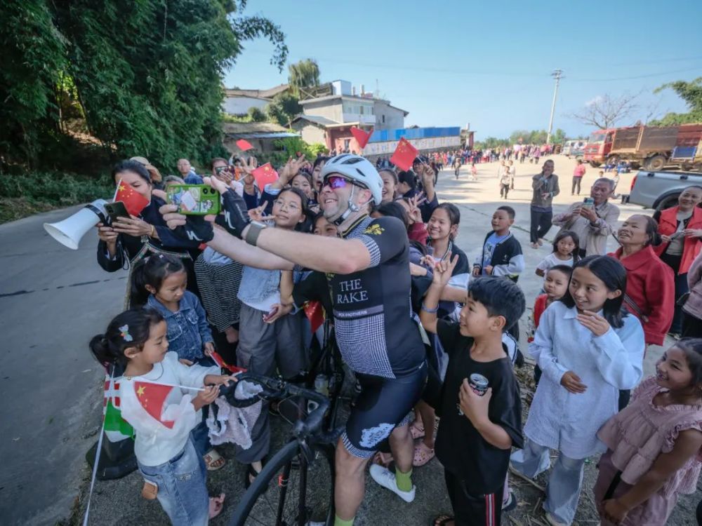 外国选手和小朋友们热情合影 七彩云南格兰芬多自行车节组委会 供图