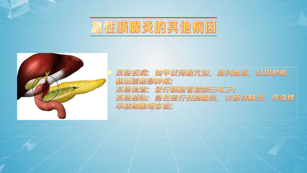 胆道疾病占50%以上,由胆道结石阻塞胆总管末端,胆汁经“共同通道”反流入胰管,损害腺泡细胞或致胰管内高压,诱发急性胰腺炎。