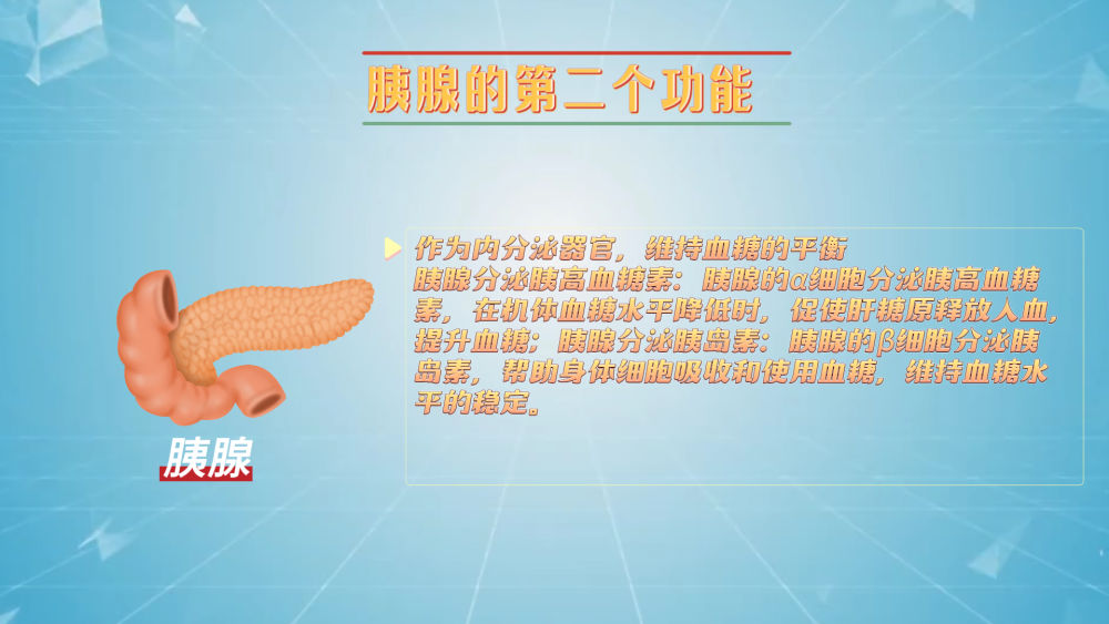 ●外分泌功能胰腺的外分泌功能主要是通过分泌胰液来实现的。胰液富含消化酶,如胰蛋白酶、淀粉酶和脂肪酶等。这些消化酶在进入小肠后,帮助我们分解食物中的蛋白质、碳水化合物和脂肪,使它们变得更易于吸收。
