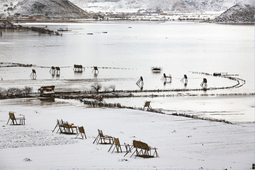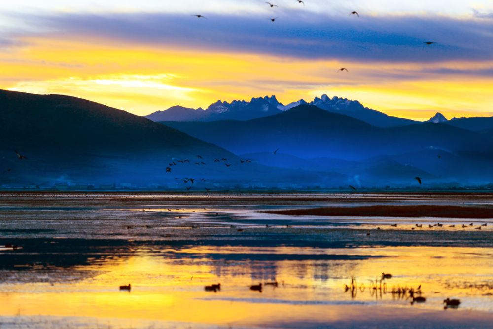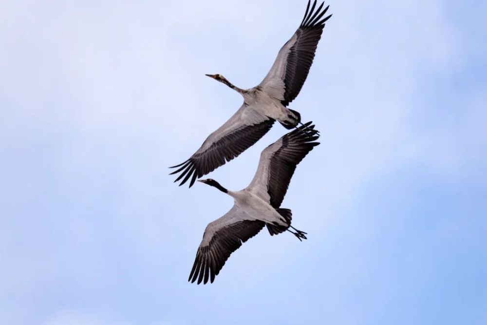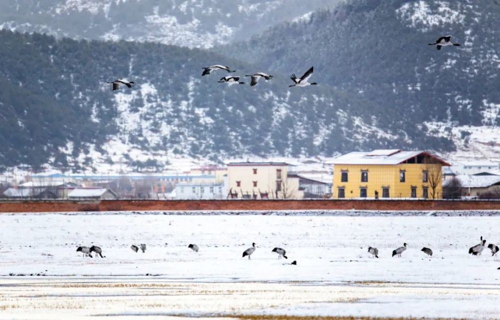 黑颈鹤飞翔在冬日纳帕海 崔永江 摄