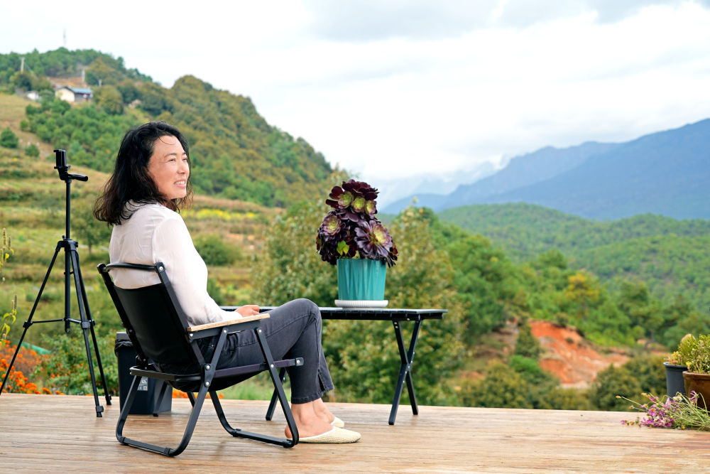 民宿管家陶戈在阳台上欣赏美景。(丽江融媒记者 吴星 摄)
