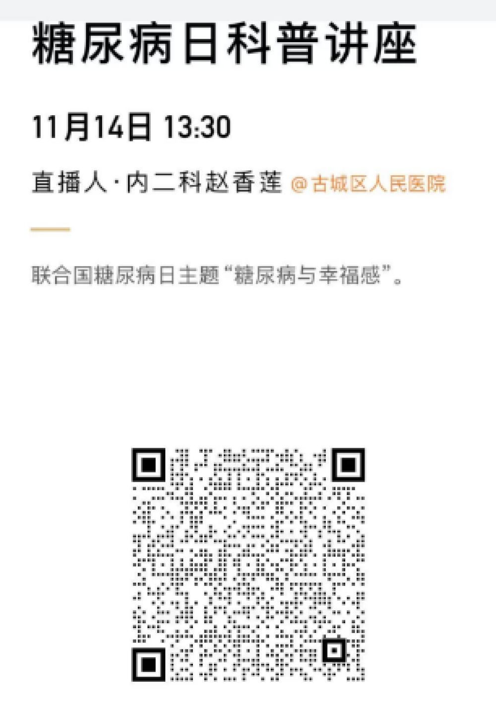为了呼吁广大人民群众了解糖尿病、关注糖尿病及提升“小糖人们”的生活幸福感,古城区人民医院内二科将开展系列主题活动,具体安排如下: