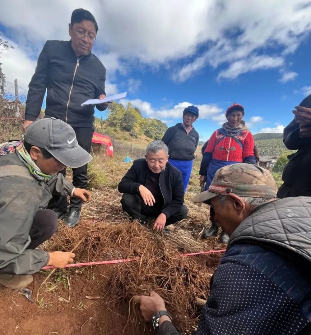 11月10日,在黄山街道南溪社区,专家组正在对云当归进行测产。(丽江融媒记者 和世民摄 )