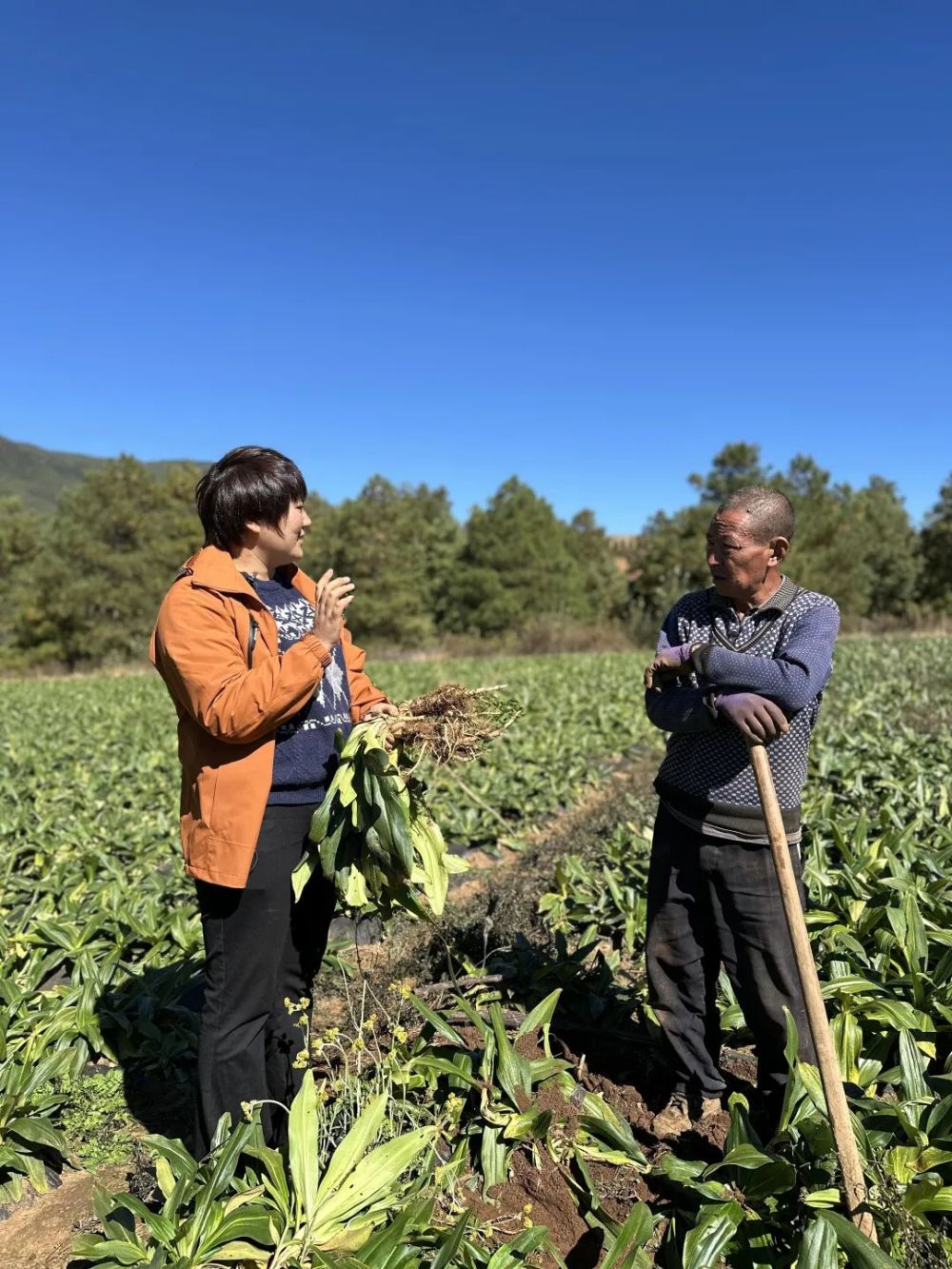杨继梅(左一)在药材地里同村民交谈。(丽江融媒记者 罗蓉 摄)