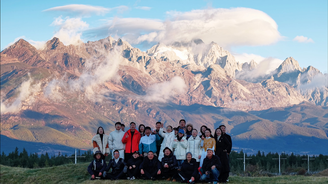 11月23日,参加“丽江数字营销人才网络宣传推介活动”的嘉宾在七号营地与“日照金山”合影。(丽江融媒记者 赵凤铭 摄)
