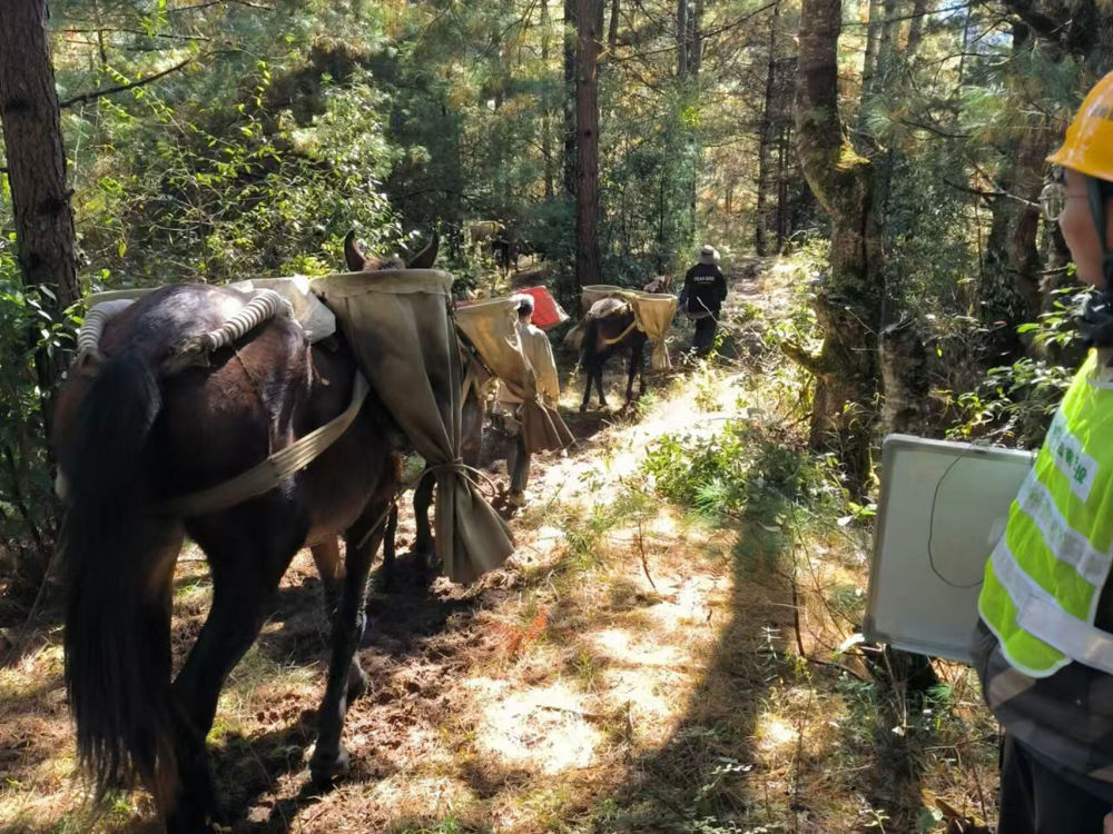 在部分施工点位,玉维高速配套设施外部供电工程施工单位因地制宜,采用畜力进行山地运输。(建设单位供图)