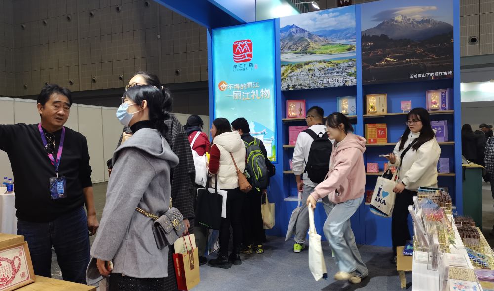 展会现场,工作人员正在介绍“丽江礼物”文创产品。(供图)