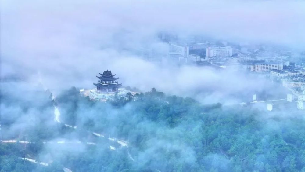 雾锁沧阳凤凰楼。(杨波 摄影)