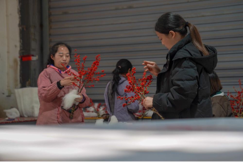 记者走访发现,冬青、五代果等新奇品类逐渐成为年宵花市场新宠。在云南新桉农业科技有限公司,工人们忙着分拣、打包从云南宣威、楚雄等地种植基地运来的北美冬青,随后发往全国各地。