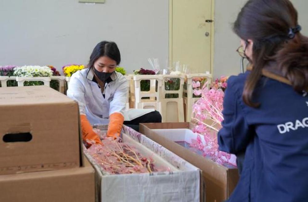 记者在该公司位于中国(云南)自由贸易试验区昆明片区的一座厂房内看到,工作人员正在对新一批银扇草进行染色、固色,开发金色、粉色的银扇草。