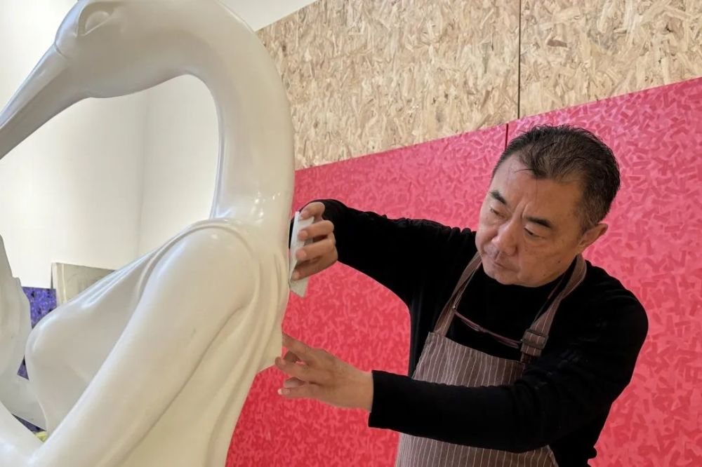 冬日的阳光里,一切都暖洋洋的。偌大的展馆里,系着围裙的古原在细心地打磨着一座纯白色的雕塑,他的大狗“CC”懒洋洋地躺在旁边打着盹儿。