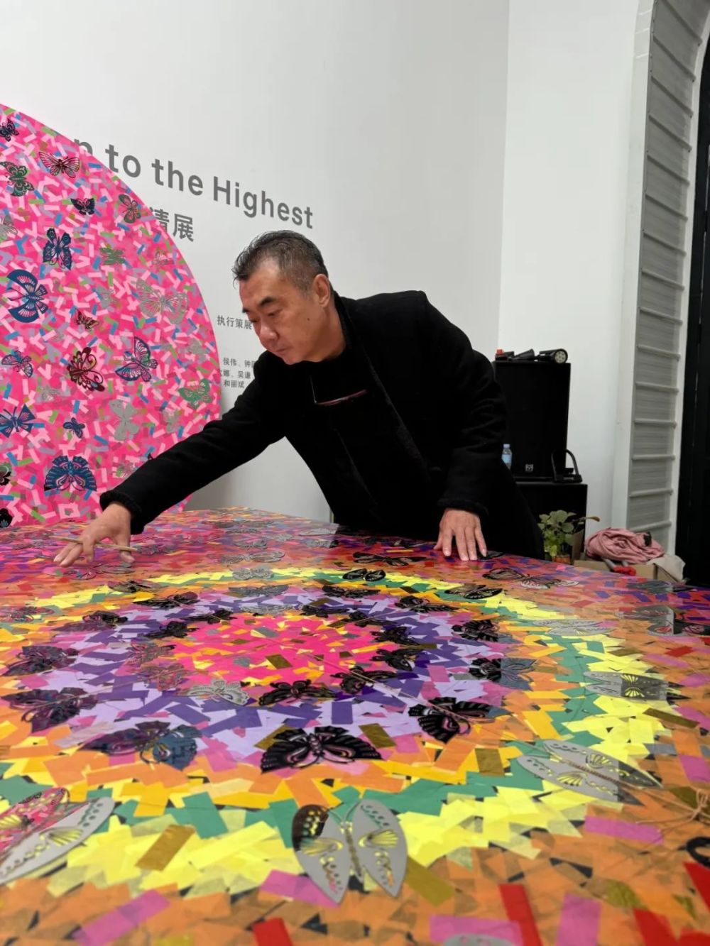 “我的花彩丽江系列作品的创作灵感来源于藏传佛教的经幡,婚礼仪式上喷射的彩带等,蕴含着祈福、美好的寓意。”古原有着多年的国外旅居创作经历,但他内心对于中华传统文化和少数民族风情一直保持着浓烈的热爱。在丽江,古原从纳西族的神话中汲取创作灵感,同时也从民间手绣工艺、民俗活动中找到了剧场的创意,以炸开的纸花碎屑拼贴而形成绘画作品,赋予了作品万象涌动的炫彩,生成出万花筒一般的图像空间。