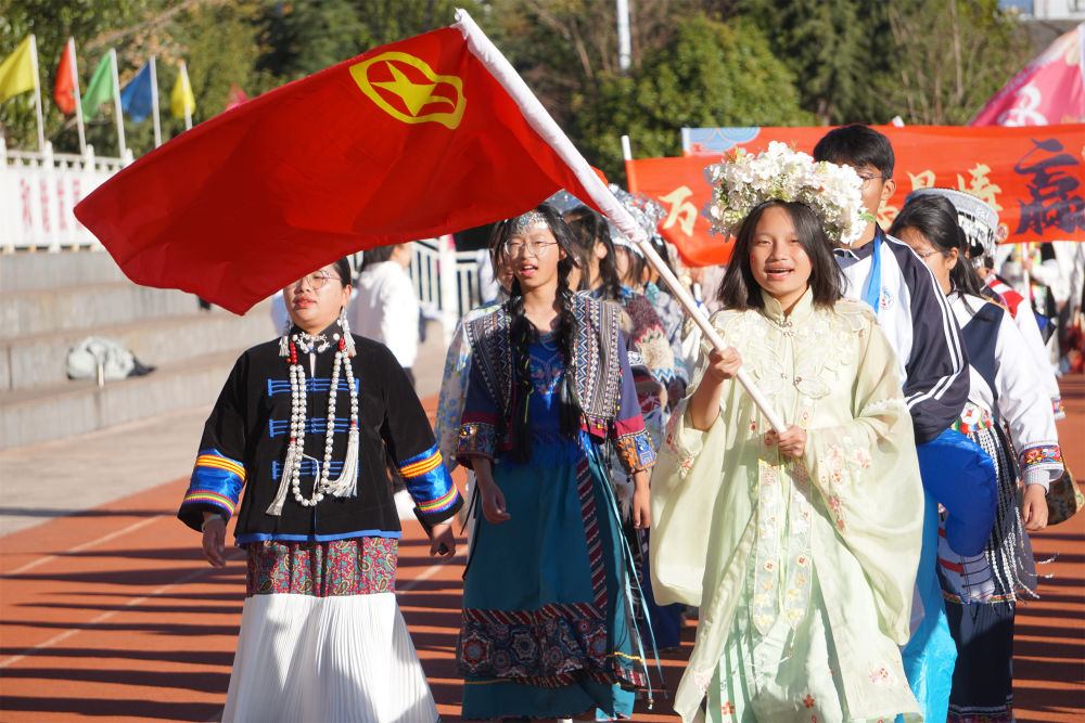 学生身着民族服饰入场。(丽江融媒记者 李桥 摄)