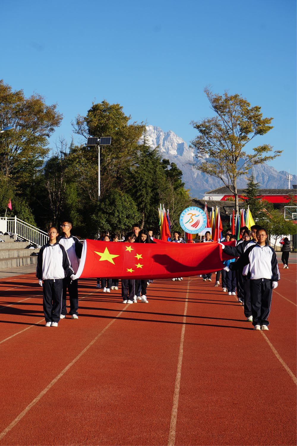 玉龙雪山下,祥和学校国旗方队的学生精神抖擞。(丽江融媒记者 李桥 摄)