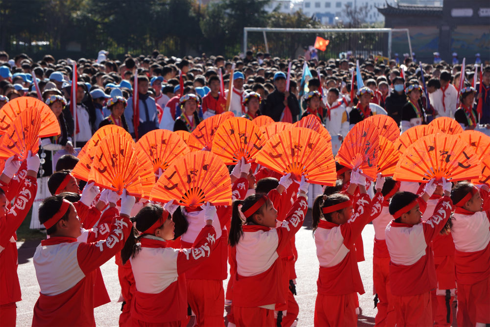 学生手持折扇正在进行入场展演。(丽江融媒记者 李桥 摄)