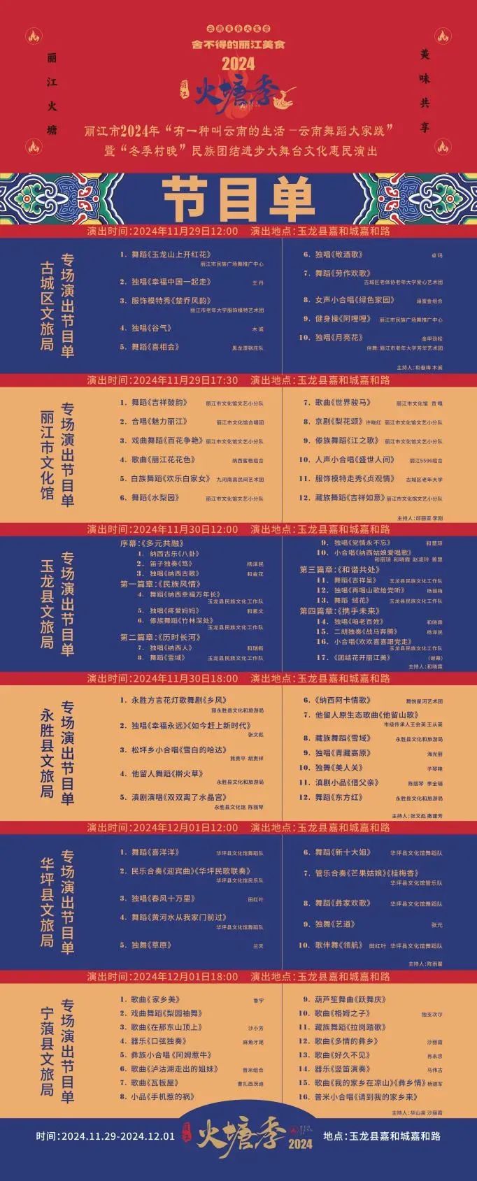 “丽江火塘季”活动不仅仅是美食的展示,更是文化的交流与碰撞。在活动期间,还举行丽江市2024年“有一种叫云南的生活一一云南舞蹈大家跳”暨“冬季村晚”民族团结进步大舞台文化惠民演出。古城区文旅局专场将在11月29日12:00上演,届时食客们可以欣赏到舞蹈《玉龙山上开红花》、独唱《幸福中国一起走》、服饰模特秀《楚乔风韵》、女声小合唱《绿色家园》、健身操《阿哩哩》等丰富多彩的歌舞演出;丽江市文化馆专场将在11月29日17:30上演。