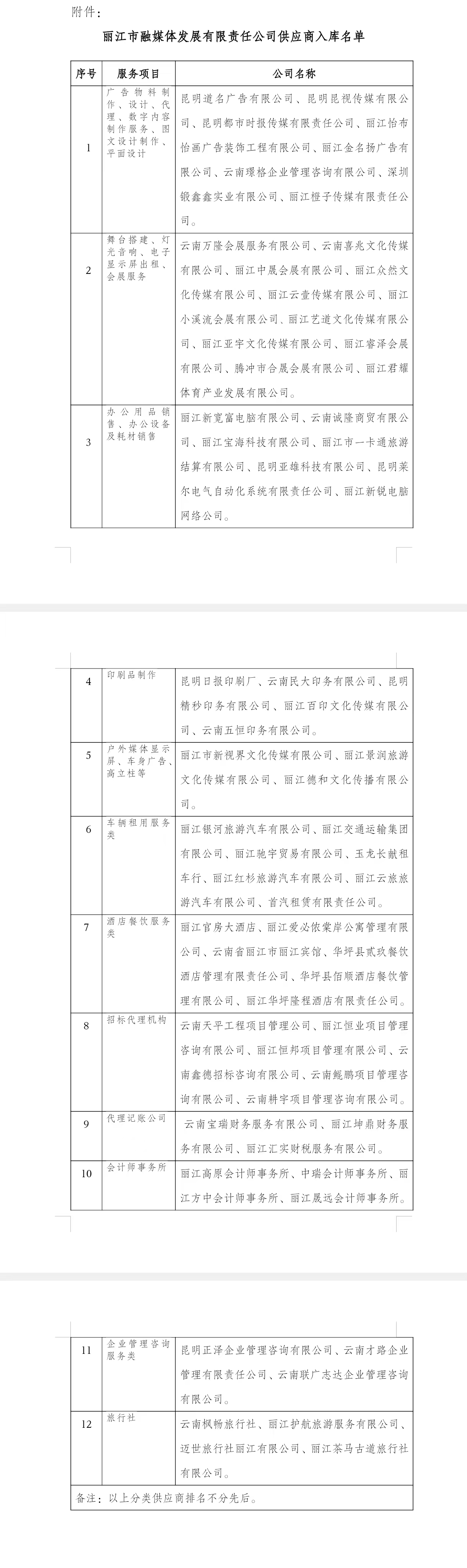 根据丽江市融媒体发展有限责任公司《关于征集服务采购供应商入库公告》,经公司内部组织评审,根据分数排名、资质条件和我公司实际相关业务和服务采购需求,拟入库的丽江市融媒体发展有限责任公司供应商库名单(详见附件)已经产生。根据工作程序,现将拟入库名单予以公示,公示时间为2024年12月2日至2024年12月6日。如有异议,请于公示期内以书面形式反馈至丽江市融媒体发展有限责任公司,并对所提异议的真实性和可靠性负责。