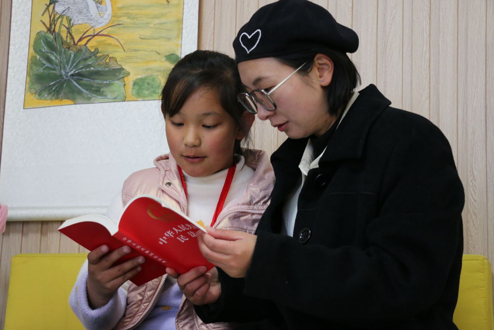 社区工作人员化身宪法小导师给孩子讲解宪法知识。(杨超 摄)