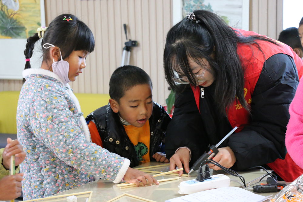 小朋友在工作人员帮助下,学习制作科技小玩具。(杨超 摄)