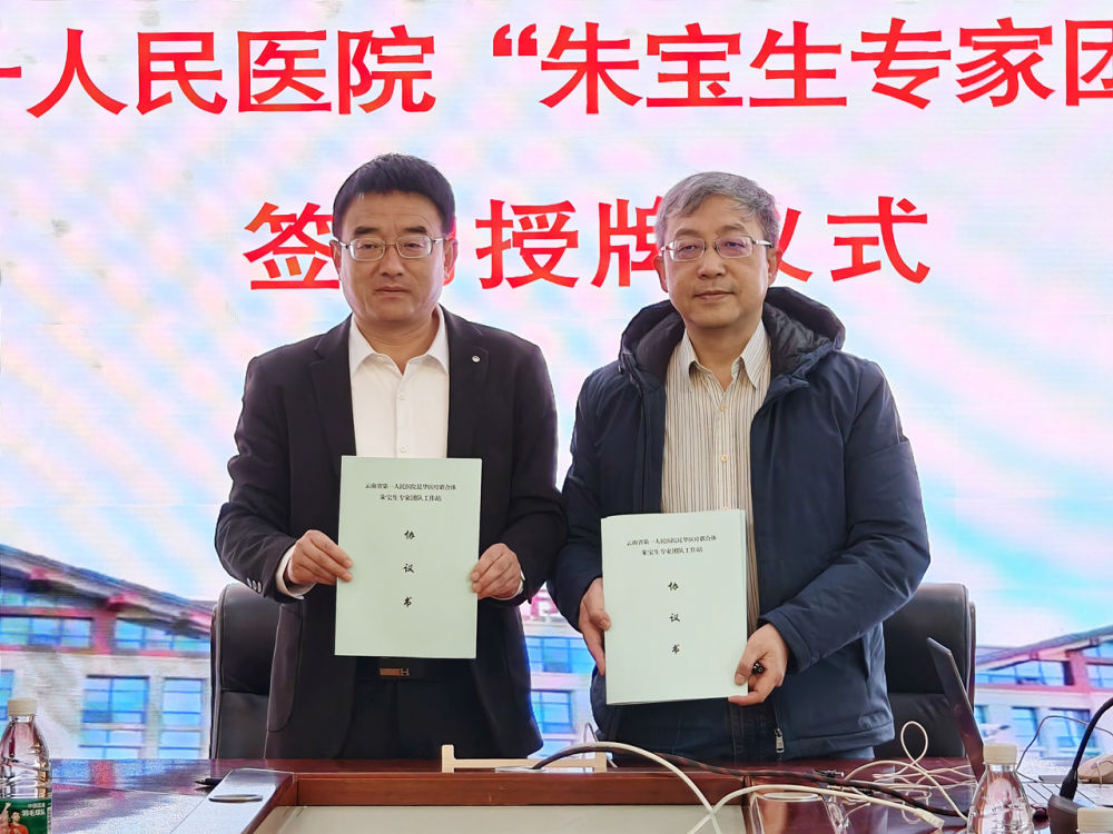 活动现场, 朱宝生教授与丽江市人民医院签署合作协议,并授予丽江市人民医院“朱宝生专家团队工作站”牌匾 。