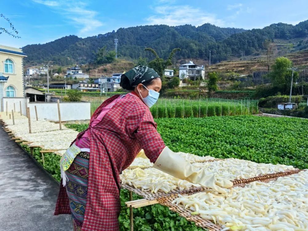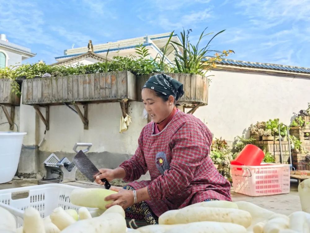 傣味腌制萝卜干这道“傣家菜”,已经成了勐旺村村民们增收致富的重要来源。走在勐旺村干净的小道上,家家户户的门外都搭起小架子晾晒着萝卜干,庭院里,勤劳的傣家人正在清洗萝卜、拌料腌制,一派忙碌景象。