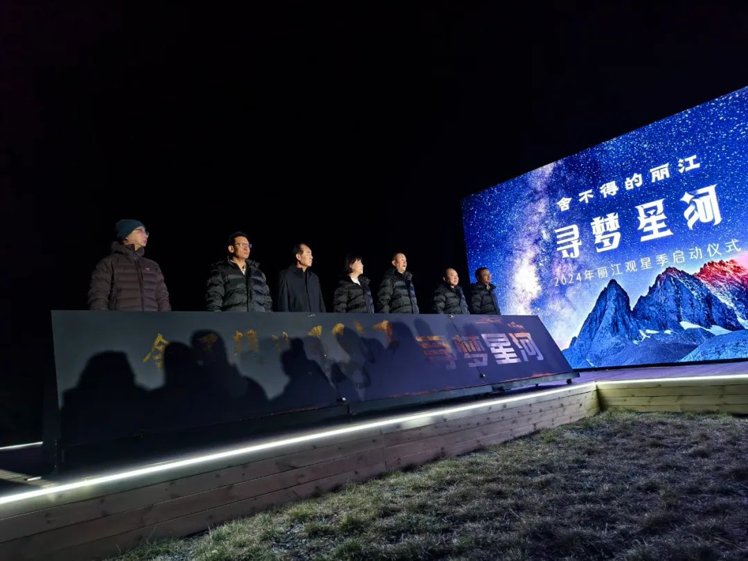出席启动仪式的浦虹、李锐、和春雷、崔家周、徐贤、吴学榕等领导和星空摄影师戴建峰一同撒下金沙,晕染出“舍不得的丽江——寻梦星河”10个金光闪闪的大字,2024年丽江观星季浪漫启动。