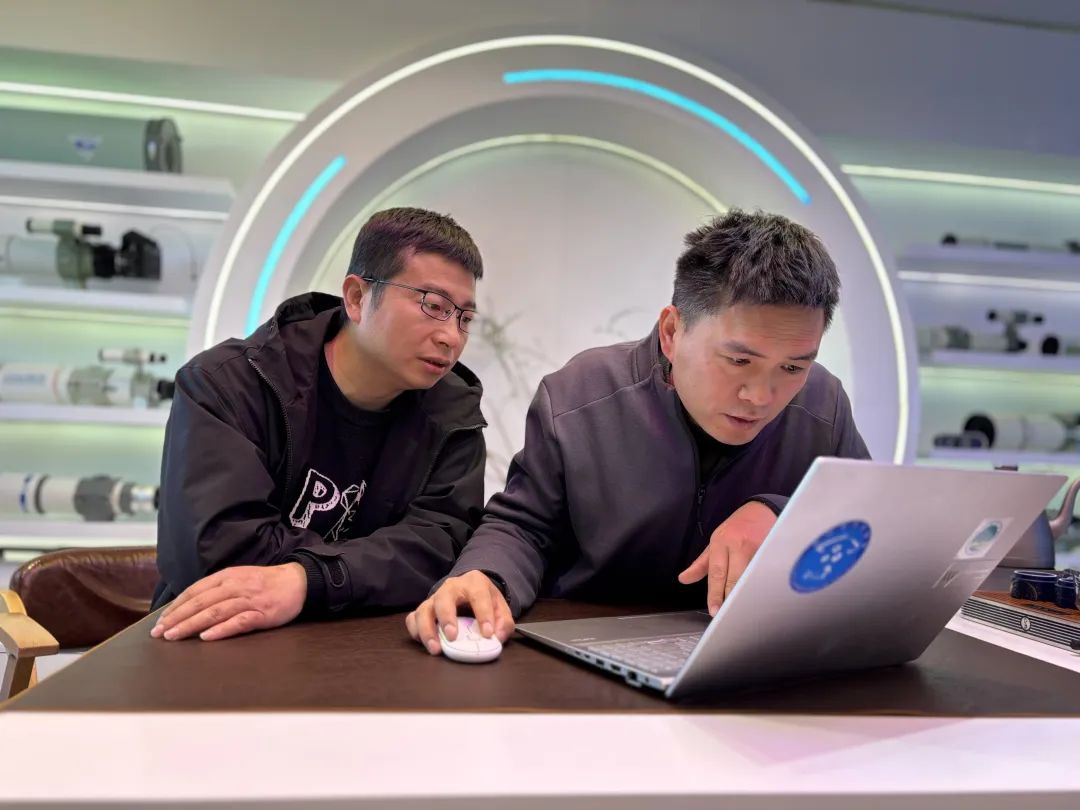 方舟(右)和游客尤伟金(左)查看拍摄星空画面。(丽江融媒记者 和宝其 摄)