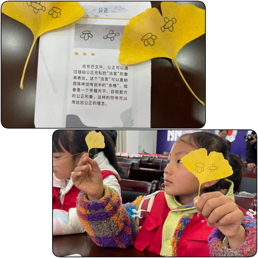 丽江融媒小记者在银杏叶上用东巴文写下公正二字。(杨四见 摄)