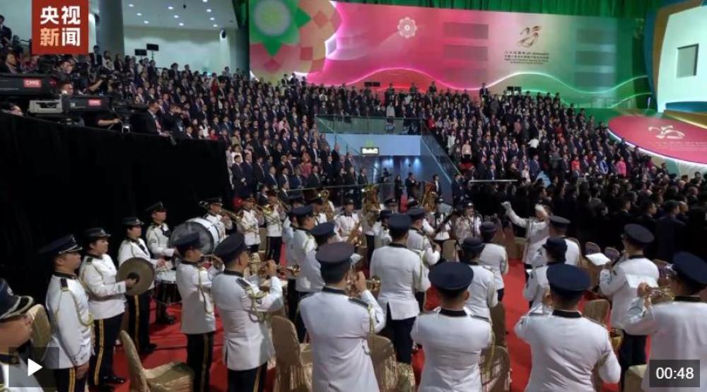 庆祝澳门回归祖国25周年大会暨澳门特别行政区第六届政府就职典礼20日上午在澳门东亚运动会体育馆隆重举行,现场全体起立,奏唱国歌。