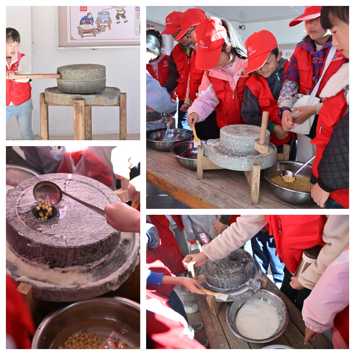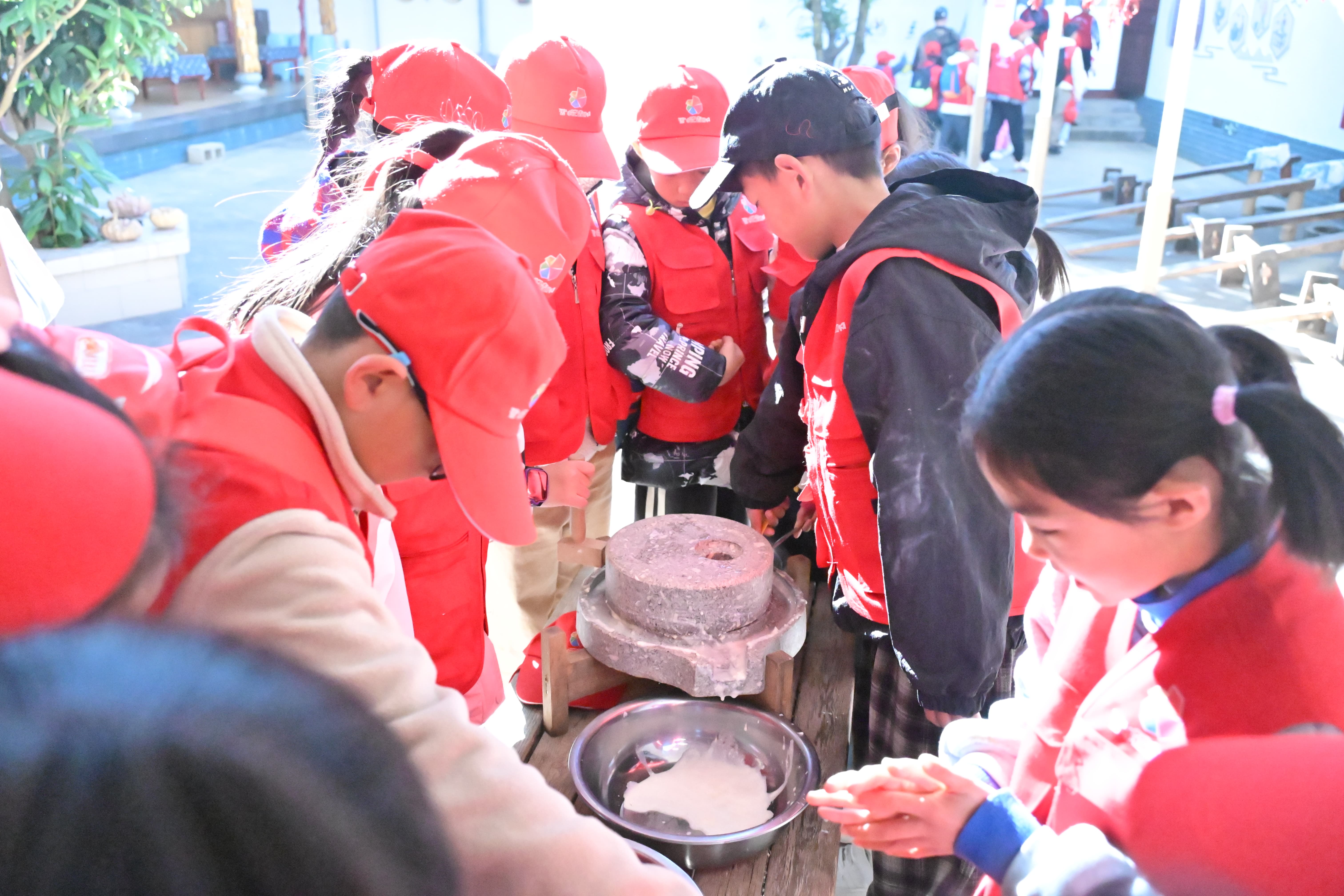 丽江融媒小记者在开南街道贵峰社区“哈滋货罗过”研学院落磨豆浆。(白万朝 摄)