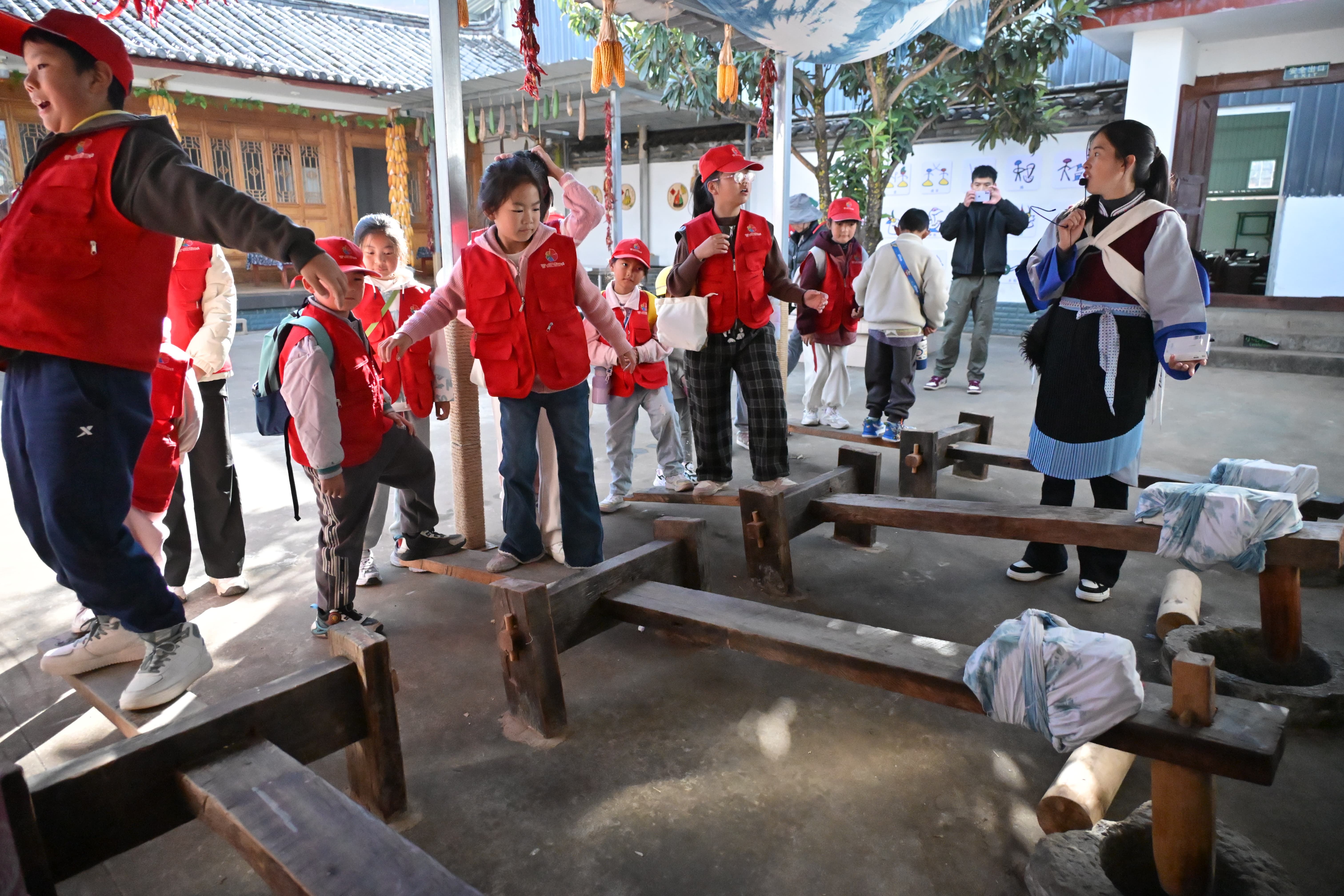 丽江融媒小记者在开南街道贵峰社区“哈滋货罗过”研学院落舂饵块。(白万朝 摄)