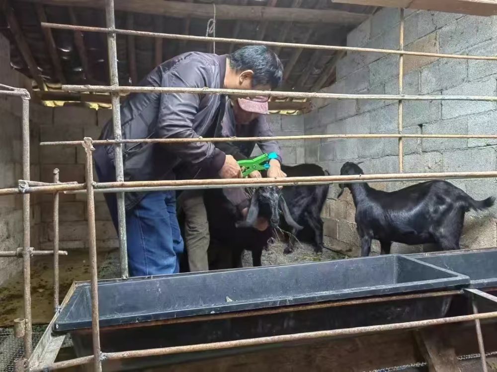 金安镇畜牧办到辖区养殖户家中查看农户黑山羊养殖情况、给黑山羊佩戴耳标。(供图)