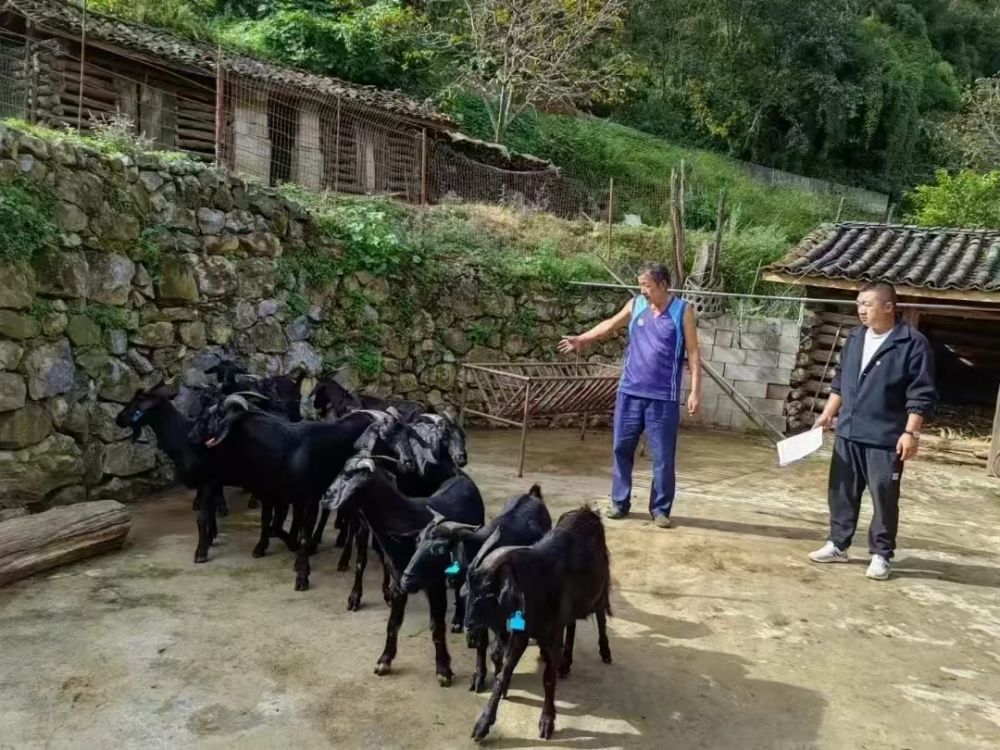 玉河村委会工作人员到养殖户家查看黑山羊养殖情况。(供图)