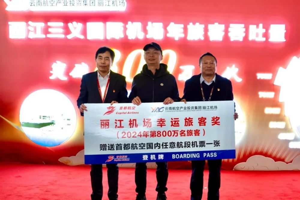 丽江三义国际机场2024年第800万名旅客(左二)。(丽江融媒记者 廖浚宏 摄)