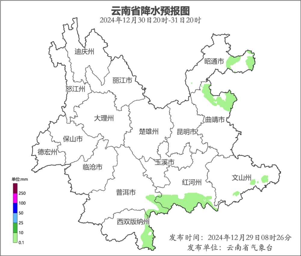 12月30日20时—31日20时:昭通市东部、曲靖市北部、文山州南部、红河州南部、普洱市东南部、西双版纳州东部多云间阴局部有小雨,其他地区多云。