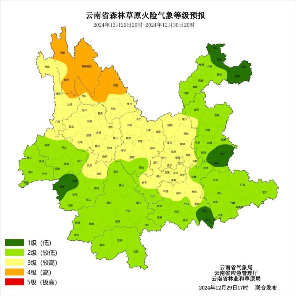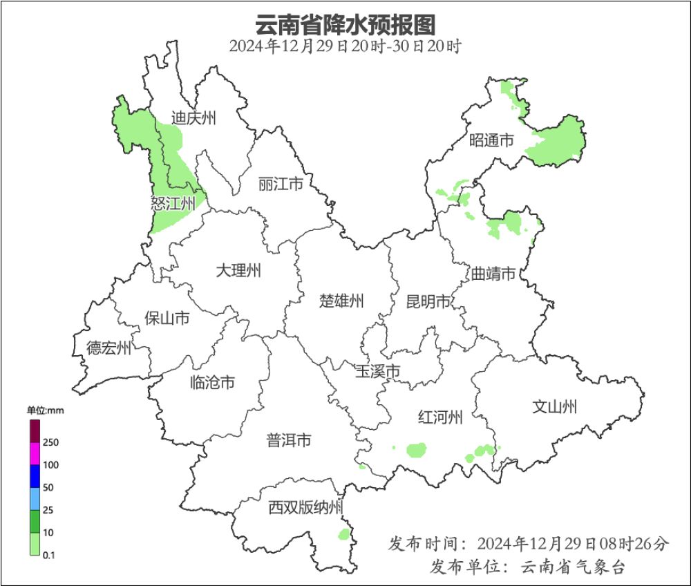 12月29日20时—30日20时:迪庆州西部、怒江州北部、昭通市北部、曲靖市北部、红河州南部多云局部有小雨,迪庆州高海拔地区有阵雪,其他地区多云间晴。